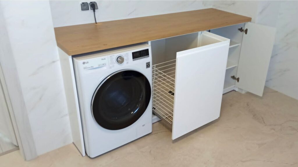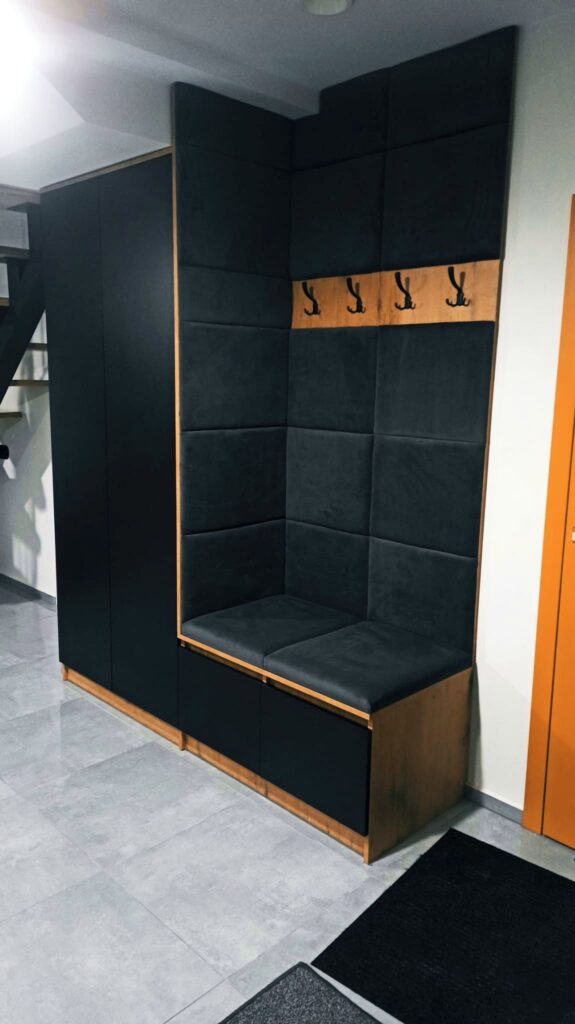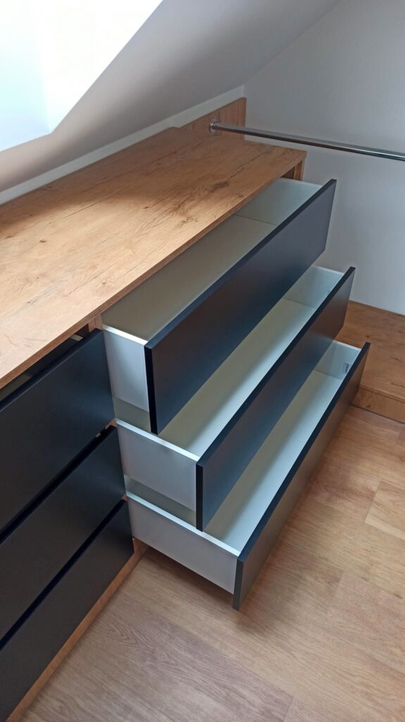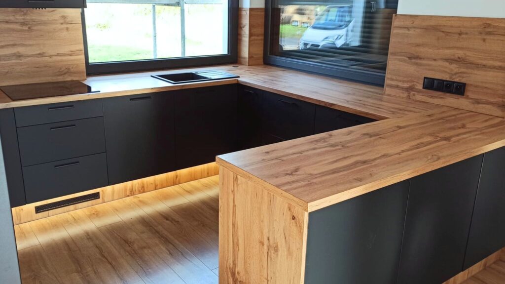Opis: Wykonane z lepszych materiałów, takich jak drewno naturalne (np. dąb, orzech) lub płyty MDF lakierowane. Meble na wymiar są dostosowane do indywidualnych potrzeb, dzięki czemu maksymalnie wykorzystuje się przestrzeń. Często zawierają nowoczesne akcesoria, takie jak systemy cichego domykania, automatyczne otwieranie szuflad czy wnętrza dostosowane do przechowywania sprzętu AGD.